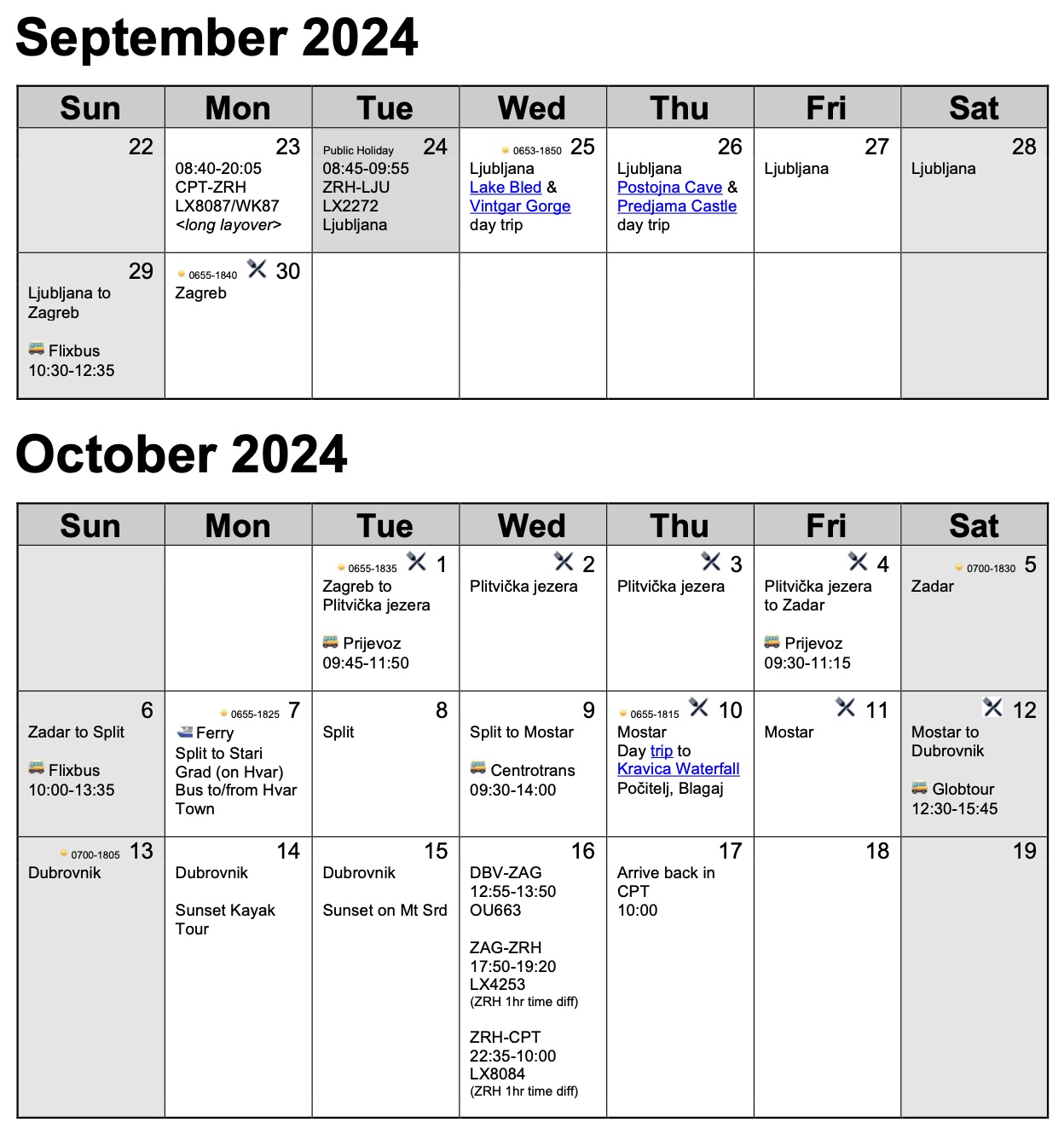 I am going to be travelling outside of EU summer, so call it on the shoulder season, after summer heading into autumn, where things should be quieter, but then also there could be the chance of cooler weather, not anything like winter but maybe just not guaranteed super warm each day, which is fine. I will go prepared for the good the bad and the ugly (weather wise). I ended up not even touching maybe 30% of the things I took. All of my internal travels will be with bus (apart from the final flight from Dubrovnik to Zagreb), on investigation rail wasn't massively popular/prevalent/present in the places I'm going to be in, so bus it was. This all worked out well in the end.